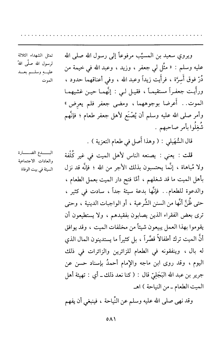 ويروي سعيد بن المسيّب مرفوعا إلى رسول الله صلى الله عليه وسلم: «مثّل لي جعفر، وزيد، وعبد الله في خيمة من درّ فوق أسرّة، فرأيت زيدا وعبد الله، وفي أعناقهما حدود، ورأيت جعفرا مستقيما، فقيل لي: إنّهما حين غشيهما الموت.. أعرضا بوجوههما، ومضى جعفر فلم يعرض» وأمر صلى الله عليه وسلم أن يصنع لأهل جعفر طعام؛ فإنّهم شغلوا بأمر صاحبهم.