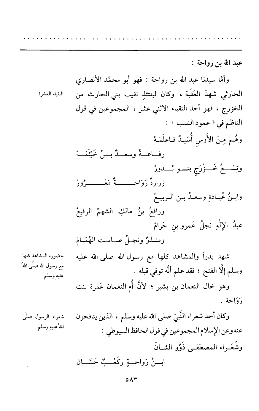 وأمّا سيدنا عبد الله بن رواحة: فهو أبو محمّد الأنصاري الحارثي شهد العقبة، وكان ليلتئذ نقيب بني الحارث من الخزرج، فهو أحد النقباء الاثني عشر، المجموعين في قول الناظم في «عمود النسب» :