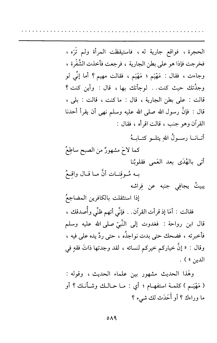 فقالت: أما إذ قرأت القرآن.. فإنّي أتهم ظنّي وأصدقك، قال ابن رواحة: فغدوت إلى النّبيّ صلى الله عليه وسلم فأخبرته، فضحك حتى بدت نواجذه، حتى ردّ يده على فيه، وقال: «إنّ خياركم خيركم لنسائه، لقد وجدتها ذات فقه في الدين» ) .