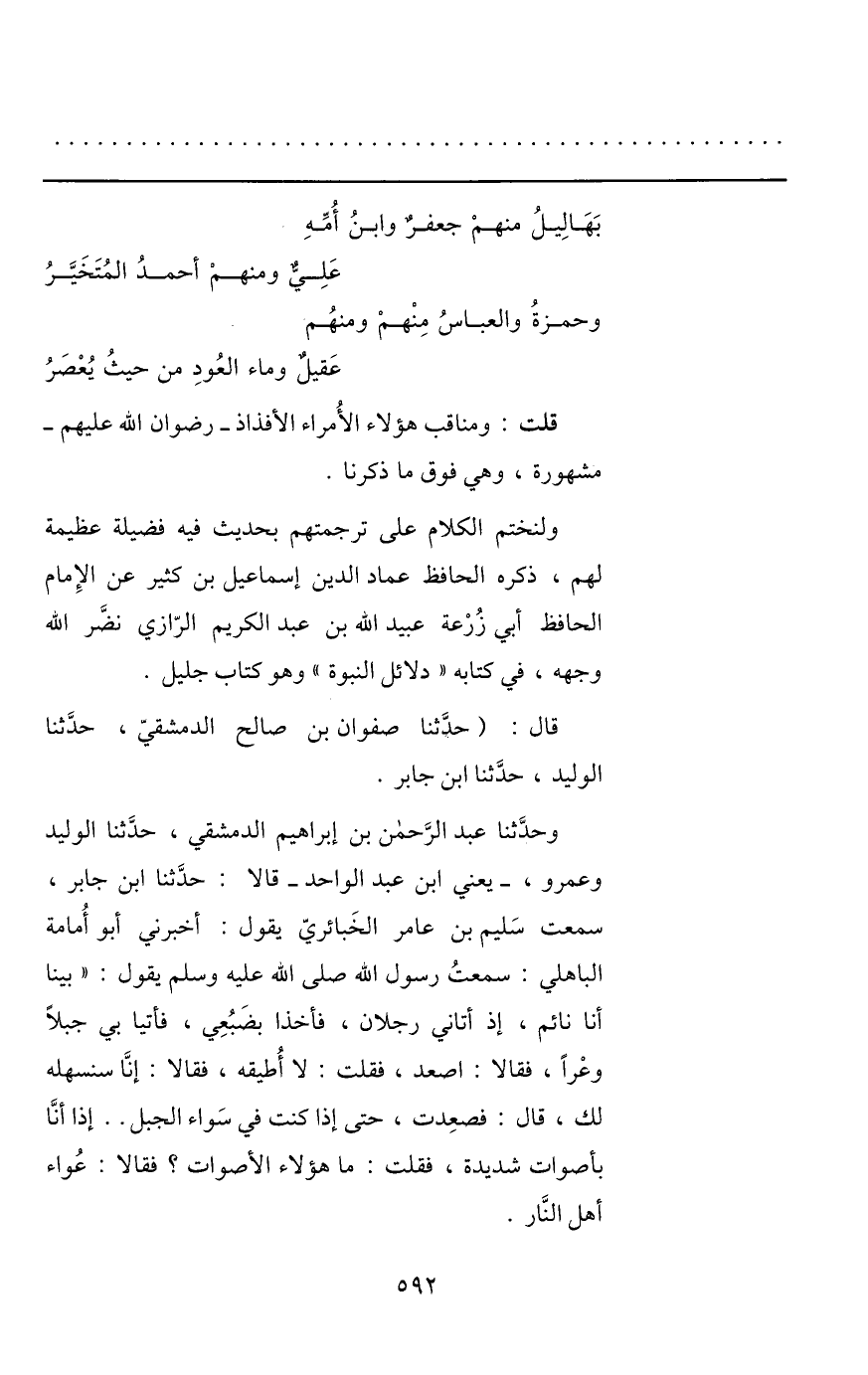 وحدّثنا عبد الرّحمن بن إبراهيم الدمشقي، حدّثنا الوليد وعمرو، - يعني ابن عبد الواحد- قالا: حدّثنا ابن جابر، سمعت سليم بن عامر الخبائريّ يقول: أخبرني أبو أمامة الباهلي: سمعت رسول الله صلى الله عليه وسلم يقول: «بينا أنا نائم، إذ أتاني رجلان، فأخذا بضبعي، فأتيا بي جبلا وعرا، فقالا: اصعد، فقلت: لا أطيقه، فقالا: إنّا سنسهله لك، قال: فصعدت، حتى إذا كنت في سواء الجبل.. إذا أنّا بأصوات شديدة، فقلت: ما هؤلاء الأصوات؟ فقالا: عواء أهل النّار.