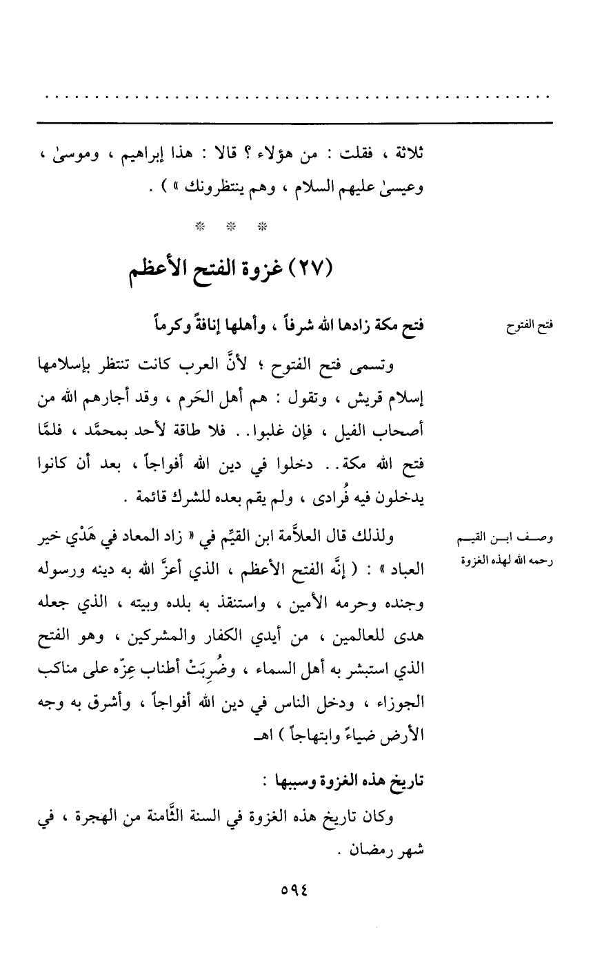 ولذلك قال العلّامة ابن القيّم في «زاد المعاد في هدي خير العباد» : (إنّه الفتح الأعظم، الذي أعزّ الله به دينه ورسوله وجنده وحرمه الأمين، واستنقذ به بلده وبيته، الذي جعله هدى للعالمين، من أيدي الكفار والمشركين، وهو الفتح الذي استبشر به أهل السماء، وضربت أطناب عزّه على مناكب الجوزاء، ودخل الناس في دين الله أفواجا، وأشرق به وجه الأرض ضياء وابتهاجا) اهـ