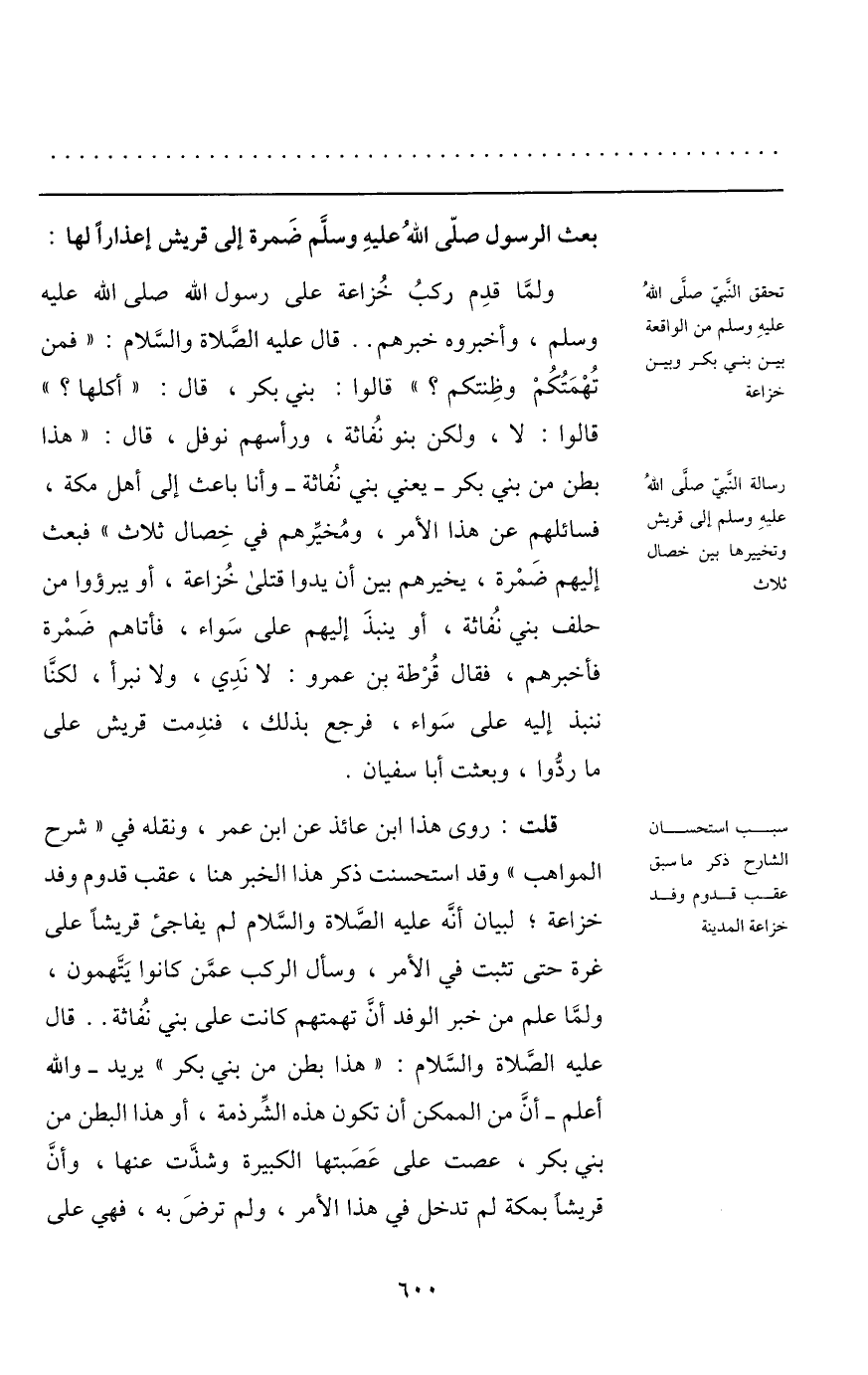 قلت: روى هذا ابن عائذ عن ابن عمر، ونقله في «شرح المواهب» وقد استحسنت ذكر هذا الخبر هنا، عقب قدوم وفد خزاعة؛ لبيان أنّه عليه الصّلاة والسّلام لم يفاجئ قريشا على غرة حتى تثبت في الأمر، وسأل الركب عمّن كانوا يتّهمون، ولمّا علم من خبر الوفد أنّ تهمتهم كانت على بني نفاثة.. قال عليه الصّلاة والسّلام: «هذا بطن من بني بكر» يريد- والله أعلم- أنّ من الممكن أن تكون هذه الشّرذمة، أو هذا البطن من بني بكر، عصت على عصبتها الكبيرة وشذّت عنها، وأنّ قريشا بمكة لم تدخل في هذا الأمر، ولم ترض به، فهي على