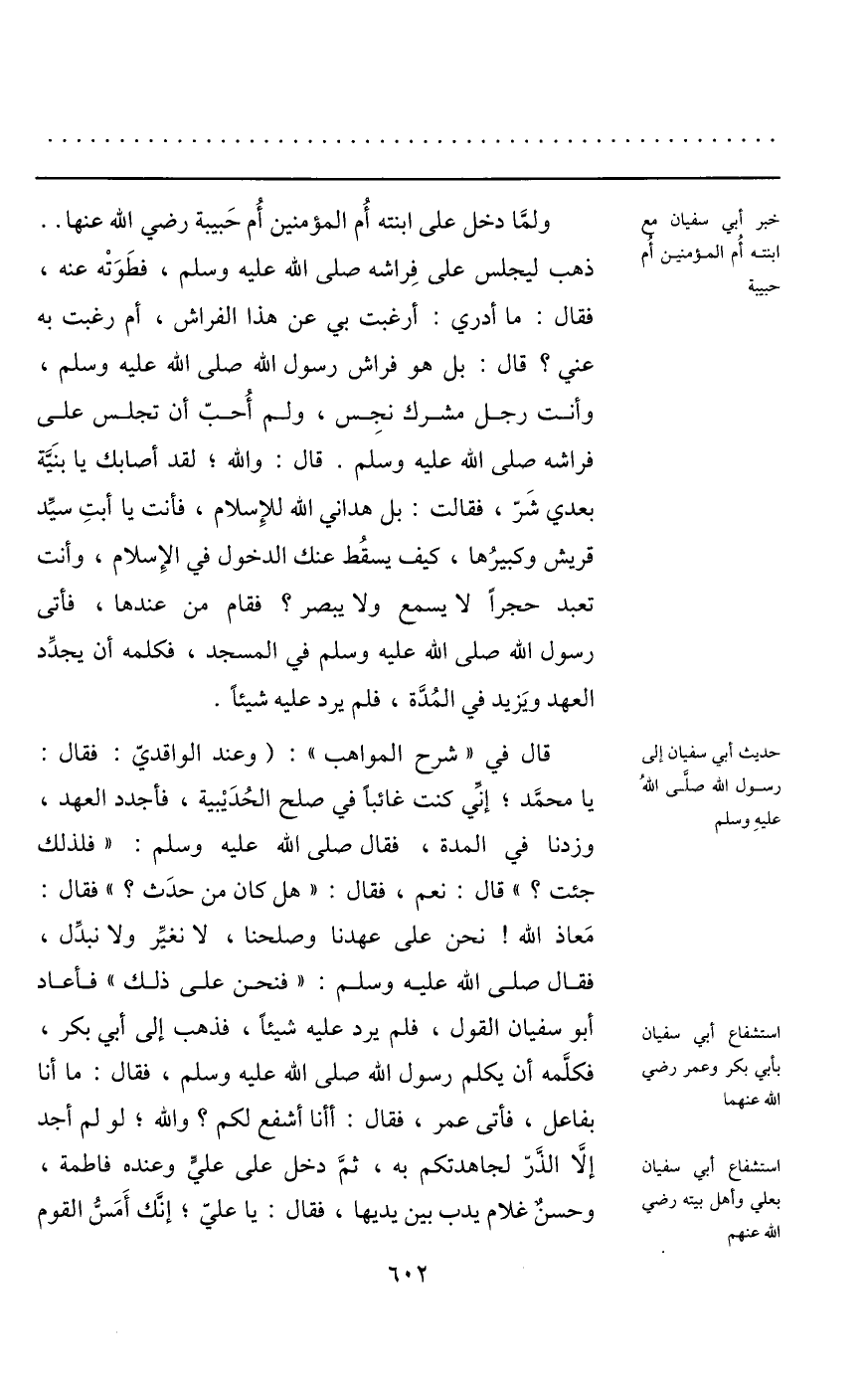 ذهب ليجلس على فراشه صلى الله عليه وسلم، فطوته عنه، فقال: ما أدري: أرغبت بي عن هذا الفراش، أم رغبت به عني؟ قال: بل هو فراش رسول الله صلى الله عليه وسلم، وأنت رجل مشرك نجس، ولم أحبّ أن تجلس على فراشه صلى الله عليه وسلم. قال: والله؛ لقد أصابك يا بنيّة بعدي شرّ، فقالت: بل هداني الله للإسلام، فأنت يا أبت سيّد قريش وكبيرها، كيف يسقط عنك الدخول في الإسلام، وأنت تعبد حجرا لا يسمع ولا يبصر؟ فقام من عندها، فأتى رسول الله صلى الله عليه وسلم في المسجد، فكلمه أن يجدّد العهد ويزيد في المدّة، فلم يرد عليه شيئا.
