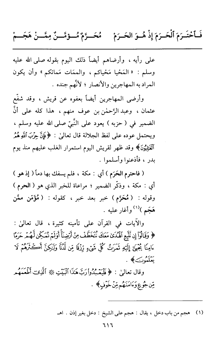 (فاحترم الحرم) أي: مكة، فلم يسفك بها دما (إذ هو) أي: مكة، وذكّر الضمير؛ مراعاة للخبر الذي هو (الحرم) وقوله: (محرّم) خبر بعد خبر، كقوله: (مؤمّن ممّن هجم) «1» وأغار عليه.
