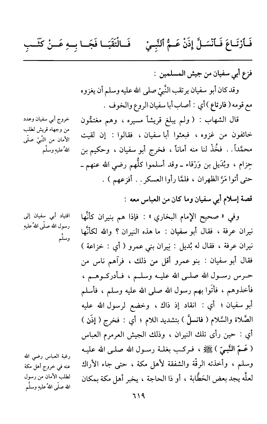 وفي «صحيح الإمام البخاري» : فإذا هم بنيران كأنّها نيران عرفة، فقال أبو سفيان: ما هذه النيران؟ والله لكأنّها نيران عرفة، فقال له بديل: نيران بني عمرو (أي: خزاعة) فقال أبو سفيان: بنو عمرو أقل من ذلك، فرآهم ناس من حرس رسول الله صلى الله عليه وسلم، فأدركوهم، فأخذوهم، فأتوا بهم رسول الله صلى الله عليه وسلم، فأسلم أبو سفيان؛ أي: انقاد إذ ذاك، وخضع لرسول الله عليه الصّلاة والسّلام (فانسلّ) بتشديد اللام؛ أي: فخرج (إذن) أي: حين رأى تلك النيران، وذلك الجيش العرموم العباس (عمّ النّبيّ) صلى الله عليه وسلم، فركب بغلة رسول الله صلى الله عليه وسلم، وأخذته الرقّة والشفقة لأهل مكة، حتى جاء الأراك لعلّه يجد بعض الحطّابة، أو ذا الحاجة، يخبر أهل مكة بمكان