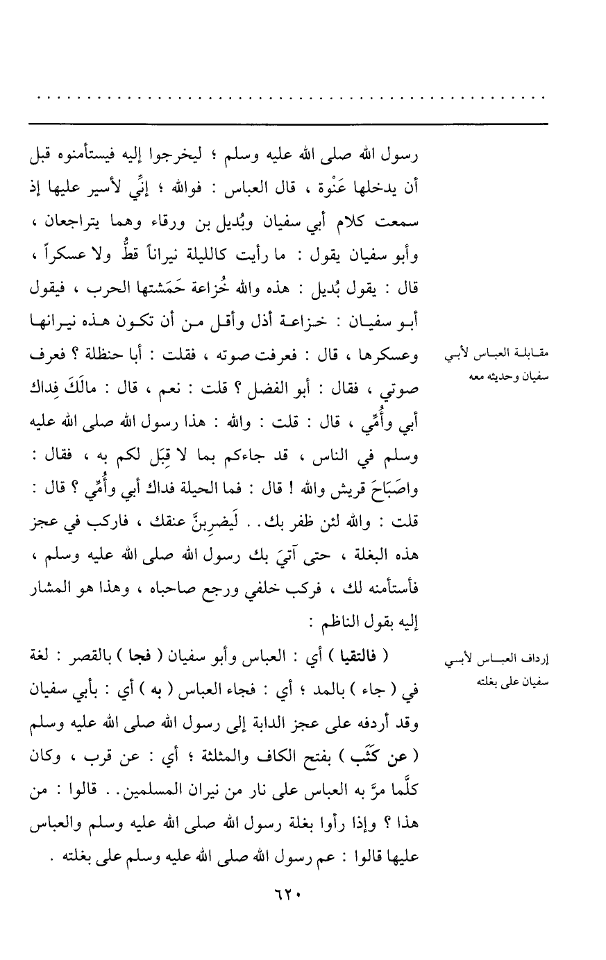 رسول الله صلى الله عليه وسلم؛ ليخرجوا إليه فيستأمنوه قبل أن يدخلها عنوة، قال العباس: فو الله؛ إنّي لأسير عليها إذ سمعت كلام أبي سفيان وبديل بن ورقاء وهما يتراجعان، وأبو سفيان يقول: ما رأيت كالليلة نيرانا قطّ ولا عسكرا، قال: يقول بديل: هذه والله خزاعة حمشتها الحرب، فيقول أبو سفيان: خزاعة أذل وأقل من أن تكون هذه نيرانها وعسكرها، قال: فعرفت صوته، فقلت: أبا حنظلة؟ فعرف صوتي، فقال: أبو الفضل؟ قلت: نعم، قال: مالك فداك أبي وأمّي، قال: قلت: والله: هذا رسول الله صلى الله عليه وسلم في الناس، قد جاءكم بما لا قبل لكم به، فقال: