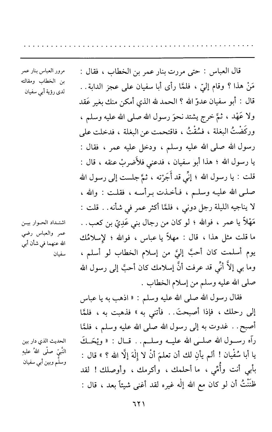 قال: أبو سفيان عدوّ الله؟ الحمد لله الذي أمكن منك بغير عقد ولا عهد، ثمّ خرج يشتد نحو رسول الله صلى الله عليه وسلم، وركضت البغلة، فسقت، فاقتحمت عن البغلة، فدخلت على رسول الله صلى الله عليه وسلم، ودخل عليه عمر، فقال: