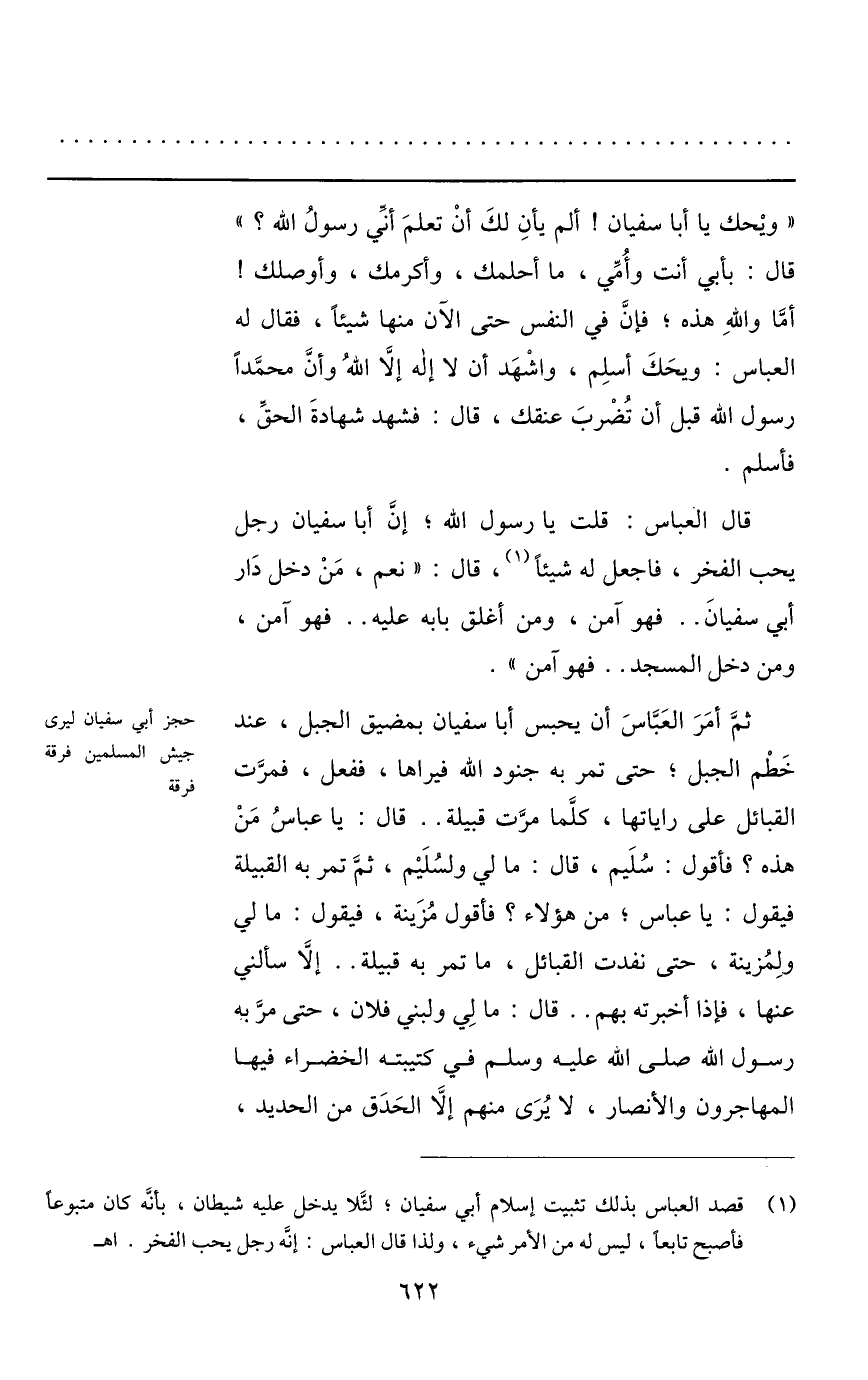 (1) قصد العباس بذلك تثبيت إسلام أبي سفيان؛ لئّلا يدخل عليه شيطان، بأنّه كان متبوعا فأصبح تابعا، ليس له من الأمر شيء، ولذا قال العباس: إنّه رجل يحب الفخر. اهـ