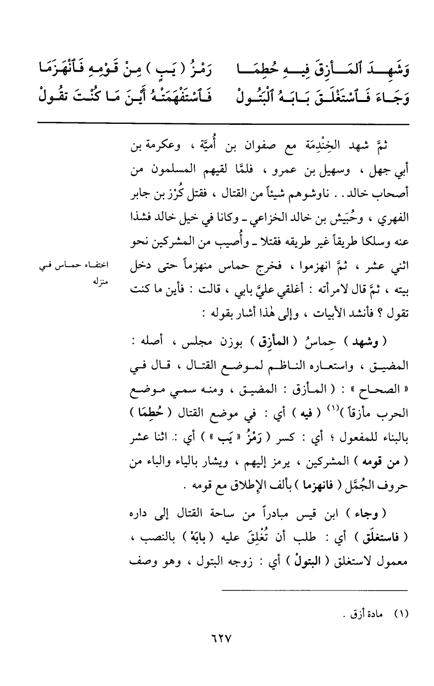 المضيق، واستعاره الناظم لموضع القتال، قال في «الصحاح» : (المأزق: المضيق، ومنه سمي موضع الحرب مأزقا) «1» (فيه) أي: في موضع القتال (حطما) بالبناء للمفعول؛ أي: كسر (رمز «يب» ) أي: اثنا عشر (من قومه) المشركين، يرمز إليهم، ويشار بالياء والباء من حروف الجمّل (فانهزما) بألف الإطلاق مع قومه.
