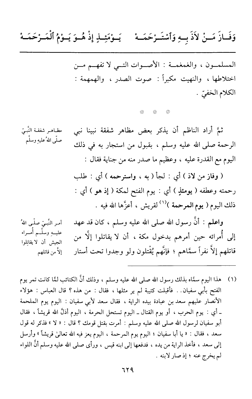 (1) هذا اليوم سمّاه بذلك رسول الله صلى الله عليه وسلم، وذلك أنّ الكتائب لمّا كانت تمر يوم الفتح بأبي سفيان.. فأقبلت كتيبة لم ير مثلها، فقال: من هذه؟ قال العباس: هؤلاء الأنصار عليهم سعد بن عبادة بيده الراية، فقال سعد لأبي سفيان: اليوم يوم الملحمة أي: يوم الحرب، أو يوم القتال- اليوم تستحل الحرمة، اليوم أذلّ الله قريشا، فقال أبو سفيان لرسول الله صلى الله عليه وسلم: أمرت بقتل قومك؟ قال: «لا» فذكر له قول سعد، فقال: «يا أبا سفيان؛ اليوم يوم المرحمة، اليوم يعز فيه الله تعالى قريشا» وأرسل إلى سعد، فأخذ الراية من يده، فدفعها إلى ابنه قيس، ورأى صلى الله عليه وسلم أنّ اللواء لم يخرج عنه؛ إذ صار لابنه.