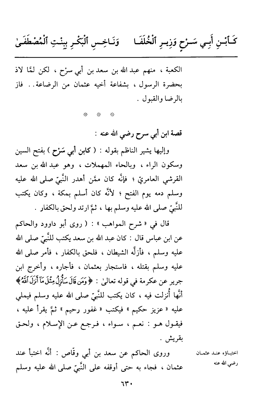 قال في «شرح المواهب» : (روى أبو داوود والحاكم عن ابن عباس قال: كان عبد الله بن سعد يكتب للنّبيّ صلى الله عليه وسلم، فأزلّه الشيطان، فلحق بالكفار، فأمر صلى الله عليه وسلم بقتله، فاستجار بعثمان، فأجاره، وأخرج ابن جرير عن عكرمة في قوله تعالى: وَمَنْ قالَ سَأُنْزِلُ مِثْلَ ما أَنْزَلَ اللَّهُ أنّها أنزلت فيه، كان يكتب للنّبيّ صلى الله عليه وسلم فيملي عليه «عزيز حكيم» فيكتب «غفور رحيم» ثمّ يقرأ عليه، فيقول هو: نعم، سواء، فرجع عن الإسلام، ولحق بقريش.