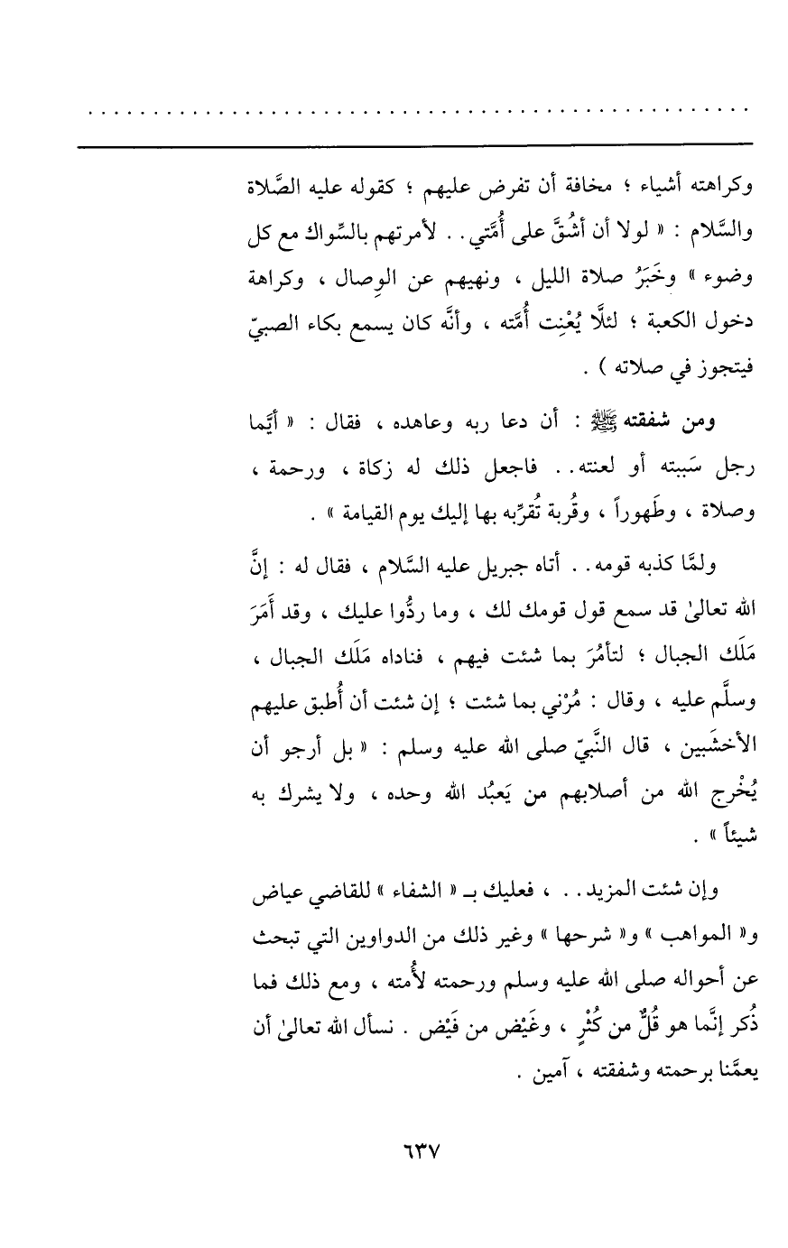 وإن شئت المزيد..، فعليك ب «الشفاء» للقاضي عياض و «المواهب» و «شرحها» وغير ذلك من الدواوين التي تبحث عن أحواله صلى الله عليه وسلم ورحمته لأمته، ومع ذلك فما ذكر إنّما هو قلّ من كثر، وغيض من فيض. نسأل الله تعالى أن يعمّنا برحمته وشفقته، آمين.