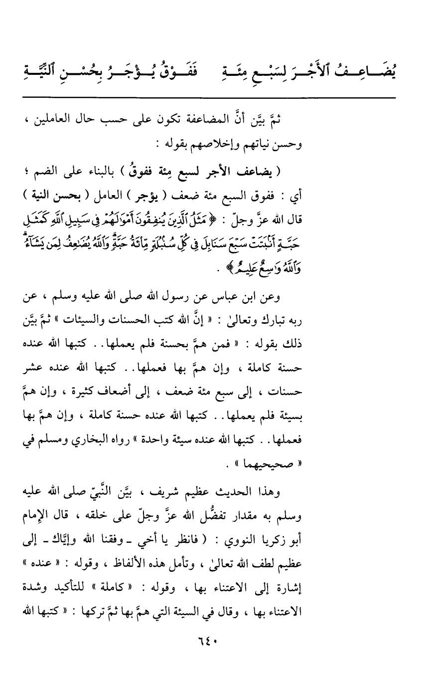 وعن ابن عباس عن رسول الله صلى الله عليه وسلم، عن ربه تبارك وتعالى: «إنّ الله كتب الحسنات والسيئات» ثمّ بيّن ذلك بقوله: «فمن همّ بحسنة فلم يعملها.. كتبها الله عنده حسنة كاملة، وإن همّ بها فعملها.. كتبها الله عنده عشر حسنات، إلى سبع مئة ضعف، إلى أضعاف كثيرة، وإن همّ بسيئة فلم يعملها.. كتبها الله عنده حسنة كاملة، وإن همّ بها فعملها.. كتبها الله عنده سيئة واحدة» رواه البخاري ومسلم في «صحيحيهما» .