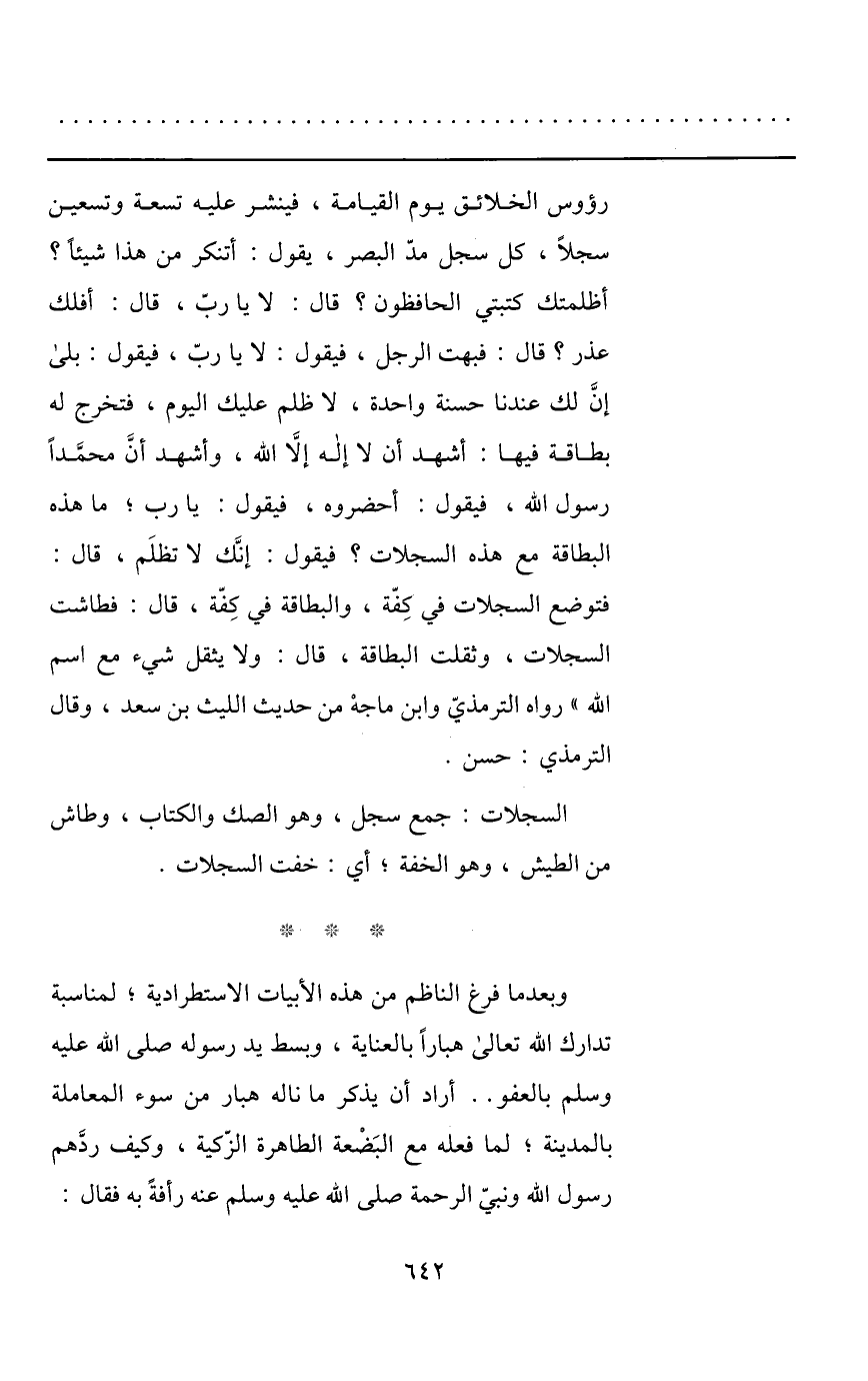 فتوضع السجلات في كفّة، والبطاقة في كفّة، قال: فطاشت السجلات، وثقلت البطاقة، قال: ولا يثقل شيء مع اسم الله» رواه الترمذيّ وابن ماجه من حديث الليث بن سعد، وقال الترمذي: حسن.