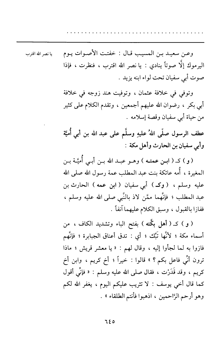 وتوفي في خلافة عثمان، وتوفيت هند زوجه في خلافة أبي بكر، رضوان الله عليهم أجمعين، وتقدم الكلام على كثير من حياة أبي سفيان وقصة إسلامه.