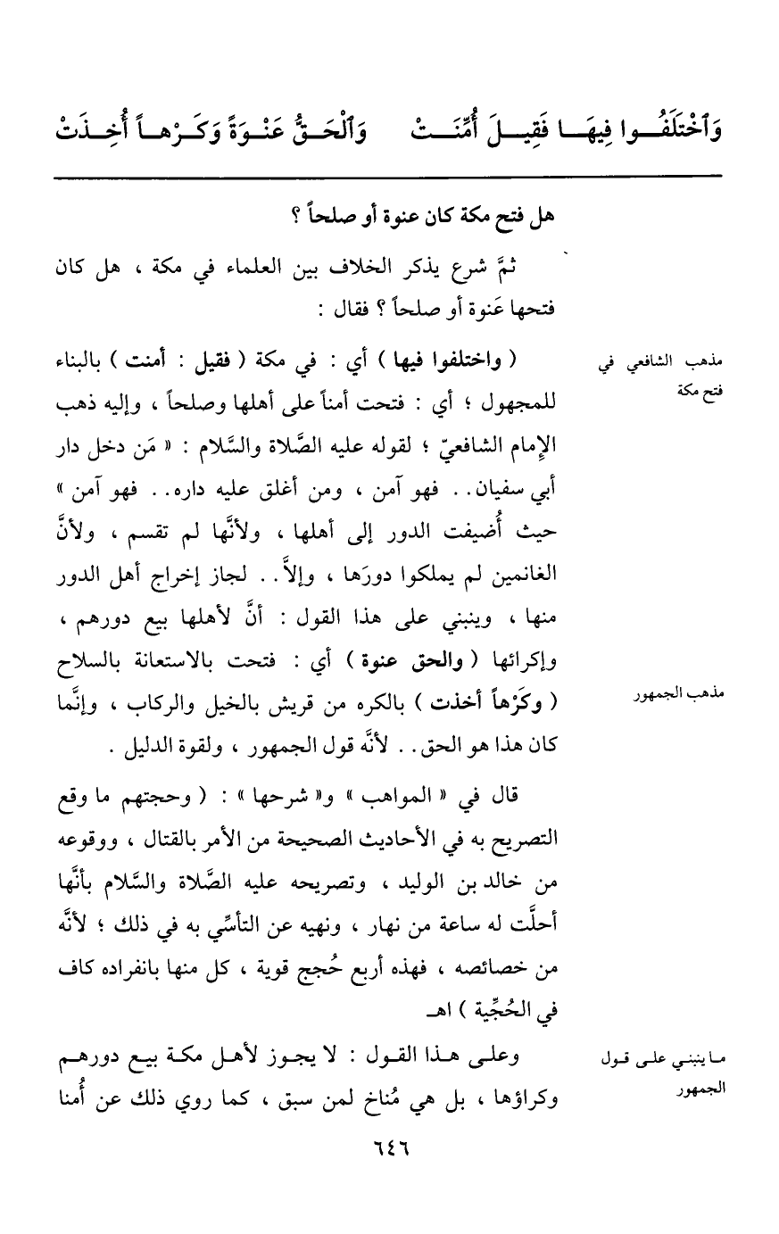 ثمّ شرع يذكر الخلاف بين العلماء في مكة، هل كان فتحها عنوة أو صلحا؟ فقال:
