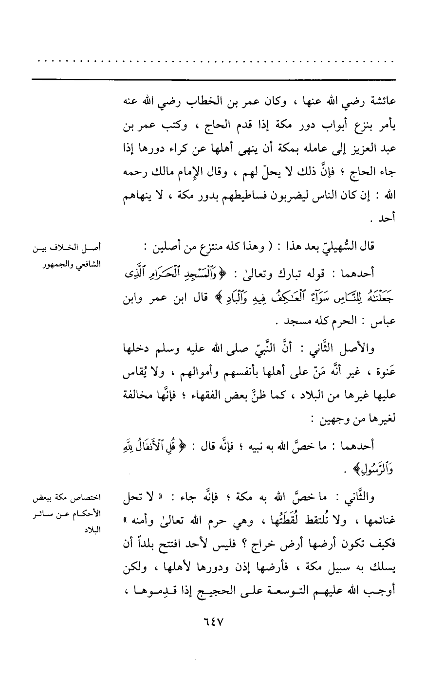 والثّاني: ما خصّ الله به مكة؛ فإنّه جاء: «لا تحل غنائمها، ولا تلتقط لقطتها، وهي حرم الله تعالى وأمنه» فكيف تكون أرضها أرض خراج؟ فليس لأحد افتتح بلدا أن يسلك به سبيل مكة، فأرضها إذن ودورها لأهلها، ولكن أوجب الله عليهم التوسعة على الحجيج إذا قدموها،