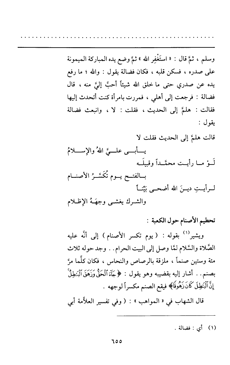 وسلم، ثمّ قال: «استغفر الله» ثمّ وضع يده المباركة الميمونة على صدره، فسكن قلبه، فكان فضالة يقول: والله؛ ما رفع يده عن صدري حتى ما خلق الله شيئا أحبّ إليّ منه، قال فضالة: فرجعت إلى أهلي، فمررت بامرأة كنت أتحدث إليها فقالت: هلمّ إلى الحديث، فقلت: لا، وانبعث فضالة يقول: