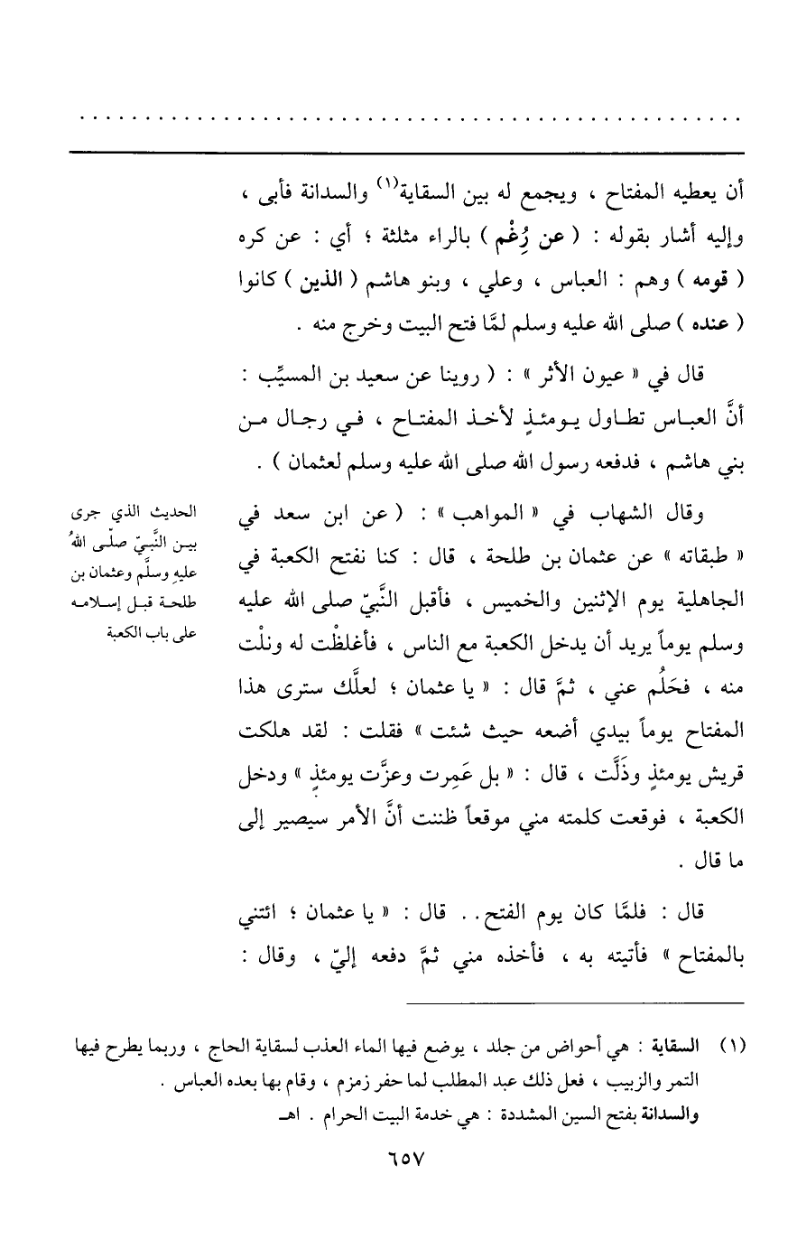 (1) السقاية: هي أحواض من جلد، يوضع فيها الماء العذب لسقاية الحاج، وربما يطرح فيها التمر والزبيب، فعل ذلك عبد المطلب لما حفر زمزم، وقام بها بعده العباس. والسدانة بفتح السين المشددة: هي خدمة البيت الحرام. اهـ