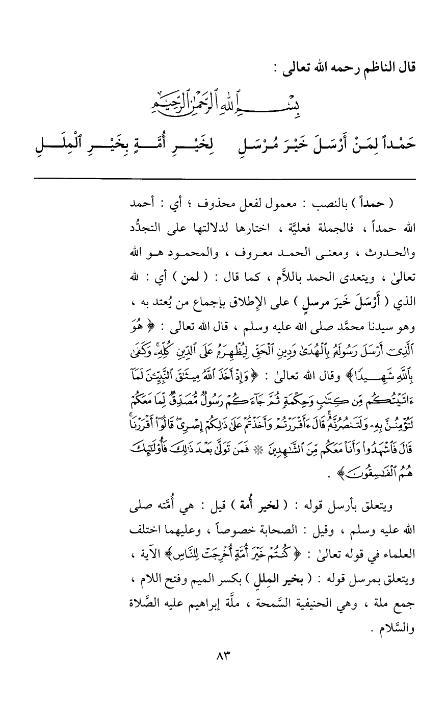 (حمدا) بالنصب: معمول لفعل محذوف؛ أي: أحمد الله حمدا، فالجملة فعليّة، اختارها لدلالتها على التجدّد والحدوث، ومعنى الحمد معروف، والمحمود هو الله تعالى، ويتعدى الحمد باللّام، كما قال: (لمن) أي: لله الذي (أرسل خير مرسل) على الإطلاق بإجماع من يعتد به، وهو سيدنا محمّد صلى الله عليه وسلم، قال الله تعالى: هُوَ الَّذِي أَرْسَلَ رَسُولَهُ بِالْهُدى وَدِينِ الْحَقِّ لِيُظْهِرَهُ عَلَى الدِّينِ كُلِّهِ وَكَفى بِاللَّهِ شَهِيداً وقال الله تعالى: وَإِذْ أَخَذَ اللَّهُ مِيثاقَ النَّبِيِّينَ لَما آتَيْتُكُمْ مِنْ كِتابٍ وَحِكْمَةٍ ثُمَّ جاءَكُمْ رَسُولٌ مُصَدِّقٌ لِما مَعَكُمْ لَتُؤْمِنُنَّ بِهِ وَلَتَنْصُرُنَّهُ قالَ أَأَقْرَرْتُمْ وَأَخَذْتُمْ عَلى ذلِكُمْ إِصْرِي قالُوا أَقْرَرْنا قالَ فَاشْهَدُوا وَأَنَا مَعَكُمْ مِنَ الشَّاهِدِينَ. فَمَنْ تَوَلَّى بَعْدَ ذلِكَ فَأُولئِكَ هُمُ الْفاسِقُونَ.