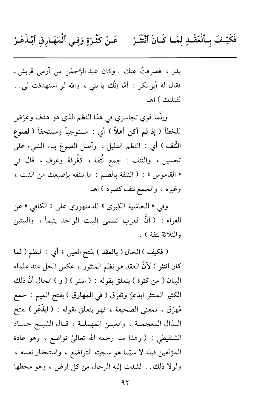 (فكيف) الحال (بالعقد) بفتح العين؛ أي: النظم (لما كان انتثر) لأنّ العقد هو نظم المنثور، عكس الحل عند علماء البيان (عن كثرة) يتعلق بقوله: (انتثر) (و) الحال أنّ ذلك الكثير المنتثر ابذعرّ وتفرق (في المهارق) بفتح الميم: جمع مهرق، بمعنى الصحيفة، فهو يتعلق بقوله: (ابذعر) بفتح الذال المعجمة، والعين المهملة، قال الشيخ حماد الشنقيطي: (وهذا منه رحمه الله تعالى تواضع، وهو عادة المؤلفين قبله لا سيّما هو سجيته التواضع، واستحقار نفسه، ولولا ذلك.. لشدت إليه الرحال من كل أرض، وهو محطها