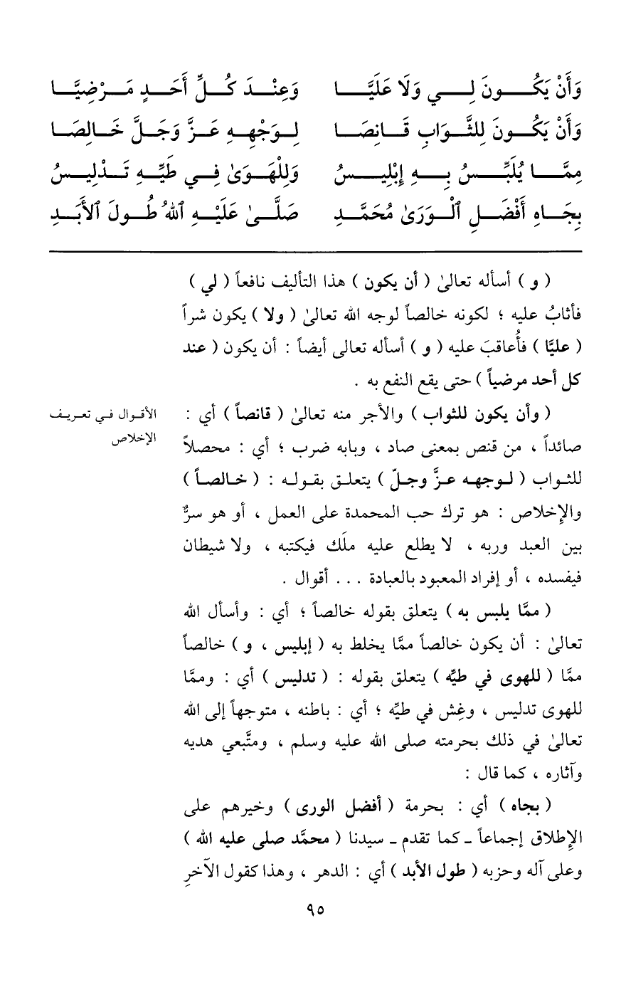 (ممّا يلبس به) يتعلق بقوله خالصا؛ أي: وأسأل الله تعالى: أن يكون خالصا ممّا يخلط به (إبليس، و) خالصا ممّا (للهوى في طيّه) يتعلق بقوله: (تدليس) أي: وممّا للهوى تدليس، وغش في طيّه؛ أي: باطنه، متوجها إلى الله تعالى في ذلك بحرمته صلى الله عليه وسلم، ومتّبعي هديه وآثاره، كما قال: