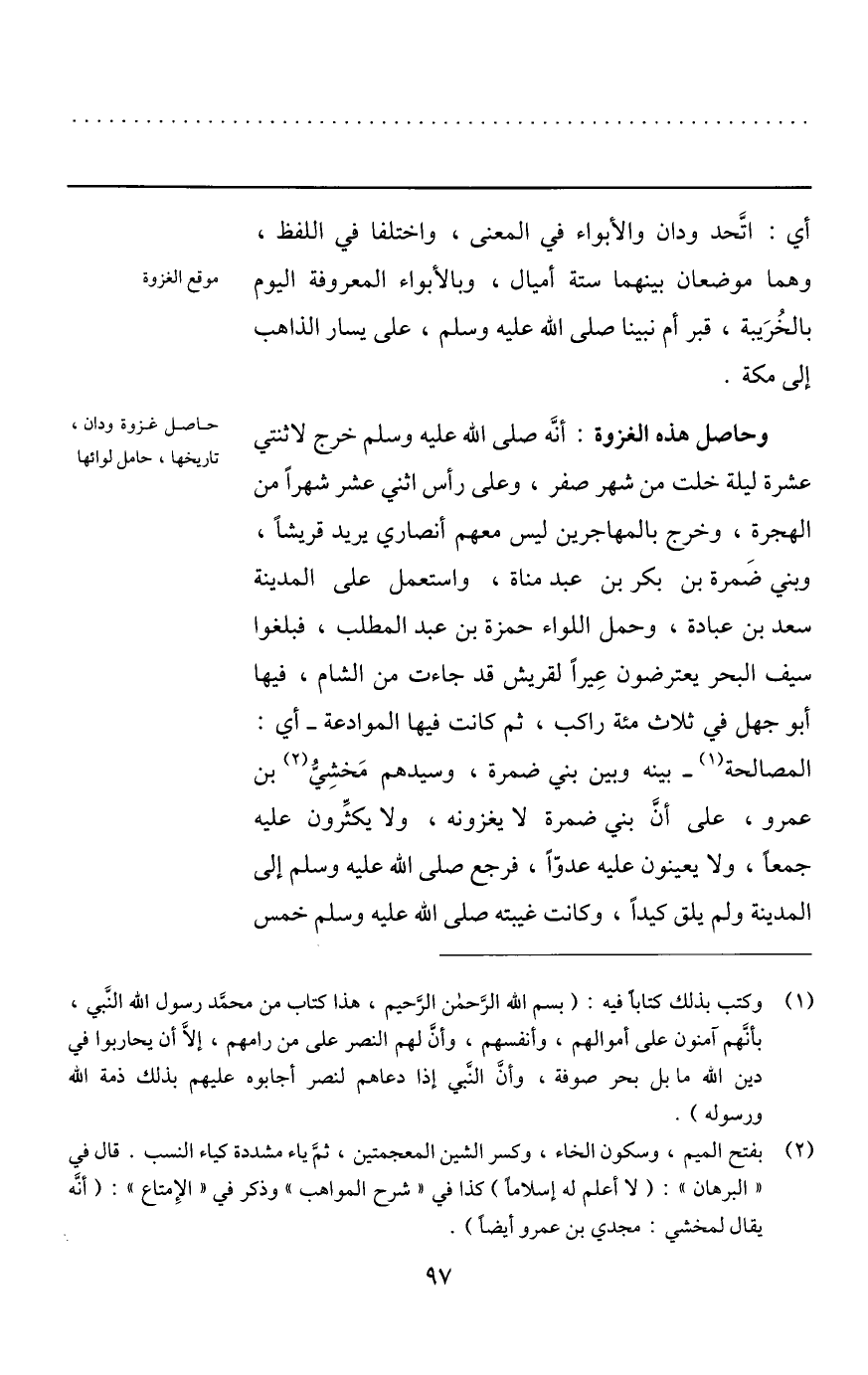 المصالحة «1» - بينه وبين بني ضمرة، وسيدهم مخشيّ «2» بن عمرو، على أنّ بني ضمرة لا يغزونه، ولا يكثّرون عليه جمعا، ولا يعينون عليه عدوّا، فرجع صلى الله عليه وسلم إلى المدينة ولم يلق كيدا، وكانت غيبته صلى الله عليه وسلم خمس