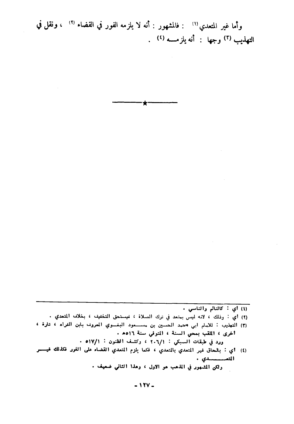 وَأما غير الْمُتَعَدِّي فَالْمَشْهُور أَنه لَا يلْزمه الْفَوْر فِي الْقَضَاء وَنقل فِي التَّهْذِيب وَجها أَنه يلْزمه