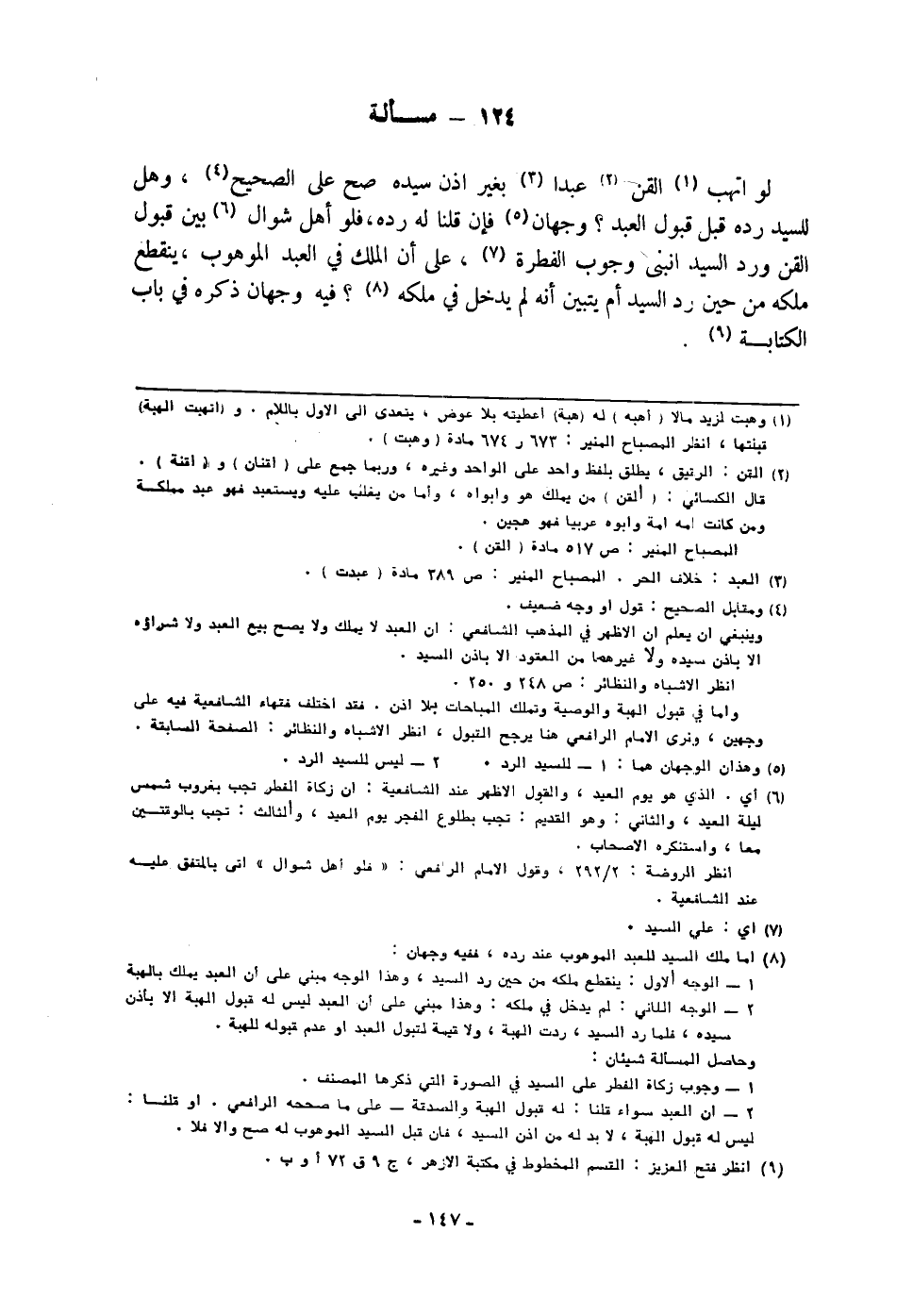 لَو اتهب الْقِنّ عبدا بِغَيْر إِذن سَيّده صَحَّ على الصَّحِيح وَهل للسَّيِّد رده قبل قبُول العَبْد وَجْهَان فَإِن قُلْنَا لَهُ رده فَلَو أهل شَوَّال بَين قبُول الْقِنّ ورد السَّيِّد انبنى وجوب الْفطْرَة على أَن الْملك فِي العَبْد الْمَوْهُوب يَنْقَطِع ملكه من حِين رد السَّيِّد أم يتَبَيَّن أَنه لم يدْخل فِي ملكه فِيهِ وَجْهَان ذكره فِي بَاب الْكِتَابَة