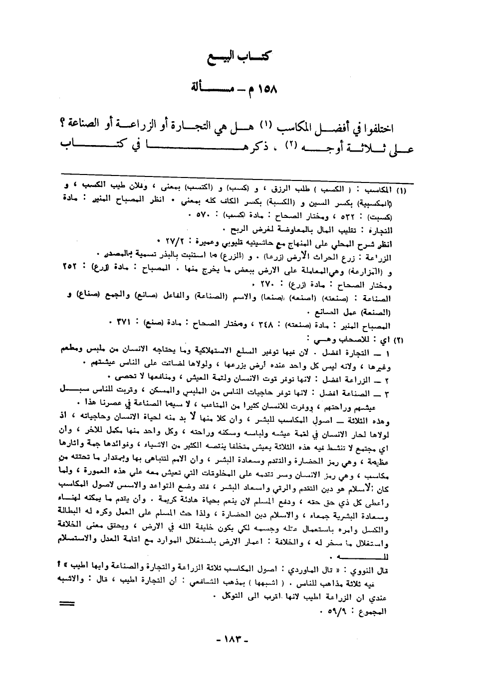 اخْتلفُوا فِي أفضل المكاسب هَل هِيَ التِّجَارَة أَو الزِّرَاعَة أَو الصِّنَاعَة على ثَلَاثَة أوجه ذكرهَا فِي كتاب