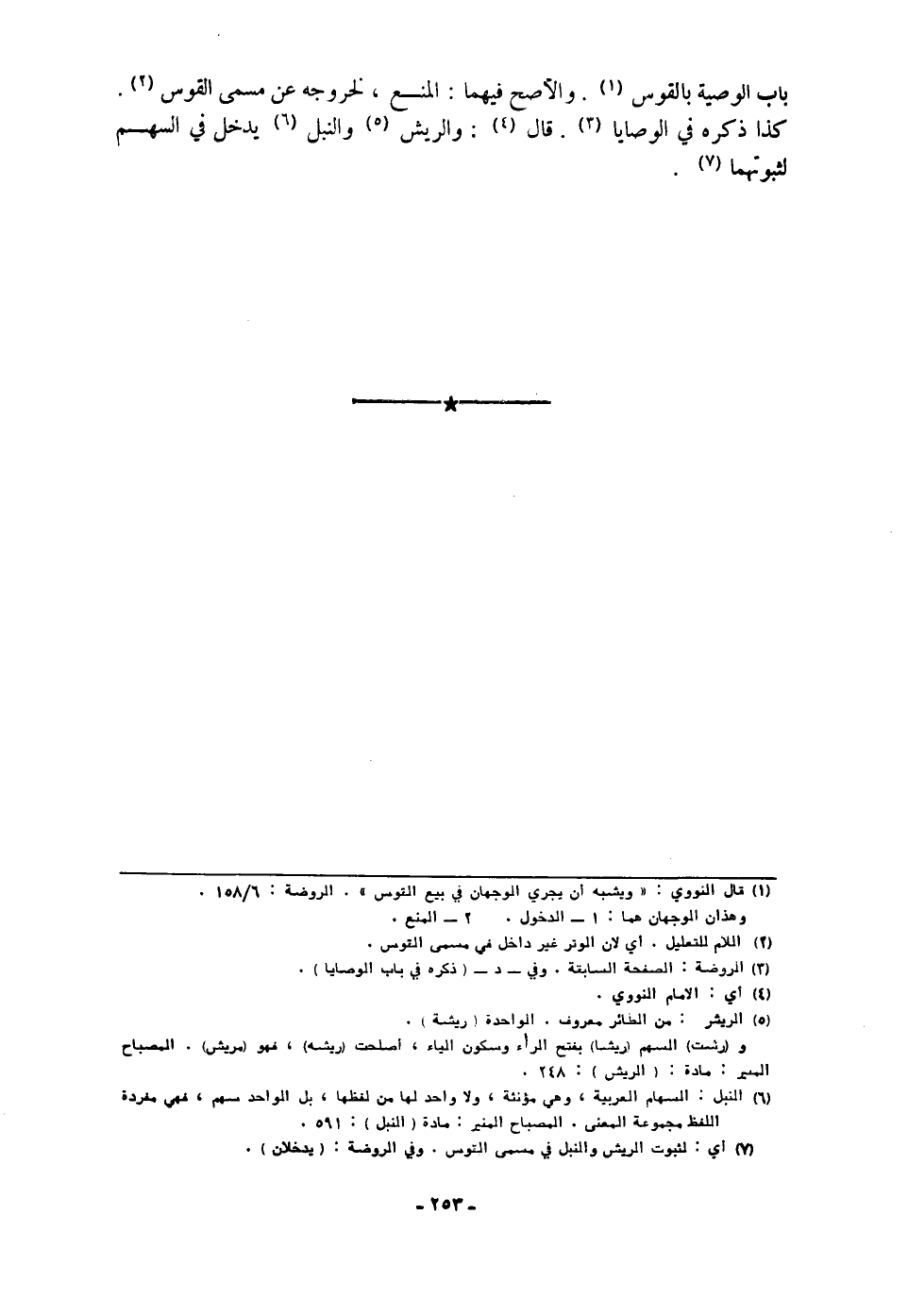 بَاب الْوَصِيَّة بِالْقَوْسِ وَالأَصَح فيهمَا الْمَنْع لِخُرُوجِهِ عَن مُسَمّى الْقوس كَذَا ذكره فِي الْوَصَايَا قَالَ والريش والنبل يدْخل فِي السهْم لثبوتهما