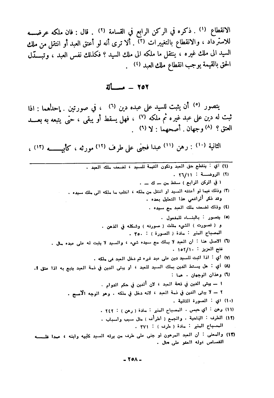 الِانْقِطَاع ذكره فِي الرُّكْن الرَّابِع فِي الْقسَامَة قَالَ فان ملكه عرضه للاسترداد والانقطاع بالتغييرات أَلا ترى أَنه لَو أعتق العَبْد أَو انْتقل من ملك السَّيِّد الى ملك غَيره ينْتَقل مَا ملكه الى ملك السَّيِّد فَكَذَلِك نفس العَبْد وتبدل الْحق بِالْقيمَةِ يُوجب انْقِطَاع ملك العَبْد