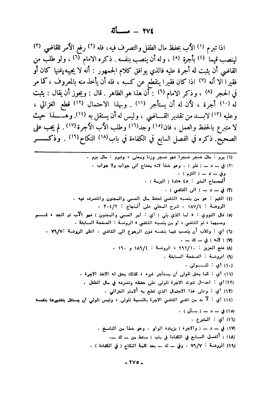 - مَسْأَلَة اذا تبرم الْأَب بِحِفْظ مَال الطلفل وَالتَّصَرُّف فِيهِ فَلهُ رفع الْأَمر للْقَاضِي لينصب قيمًا بأجره وَله أَن ينصب بِنَفسِهِ ذكره الامام وَلَو طلب من القَاضِي أَن يثبت لَهُ أجره عَلَيْهِ فَالَّذِي يُوَافق كَلَام الجهور أَنه لَا يجِيبه غَنِيا كَانَ أَو فَقِيرا الا أَنه اذا كَانَ فَقِيرا يَنْقَطِع عَن كَسبه فَلهُ أَن يَأْخُذ مِنْهُ بِالْمَعْرُوفِ كَمَا مر فِي الْحجر وَذكر الامام أَن هَذَا هُوَ الظَّاهِر قَالَ وَيجوز أَن يُقَال يثبت لَهُ أُجْرَة لِأَن لَهُ أَن يسْتَأْجر وَبِهَذَا الِاحْتِمَال قطع الْغَزالِيّ وَعَلِيهِ لَا بُد من تَقْدِير القَاضِي وَلَيْسَ أَن يسْتَقلّ بِهِ وَهَذَا حَيْثُ لَا مُتَبَرّع بِالْحِفْظِ وَالْعَمَل فان وجد وَطلب الْأَب الْأُجْرَة لم يجب على الصَّحِيح ذكره فِي الْفَصْل السَّابِع فِي الْكَفَاءَة فِي بَاب النِّكَاح وَذكر
