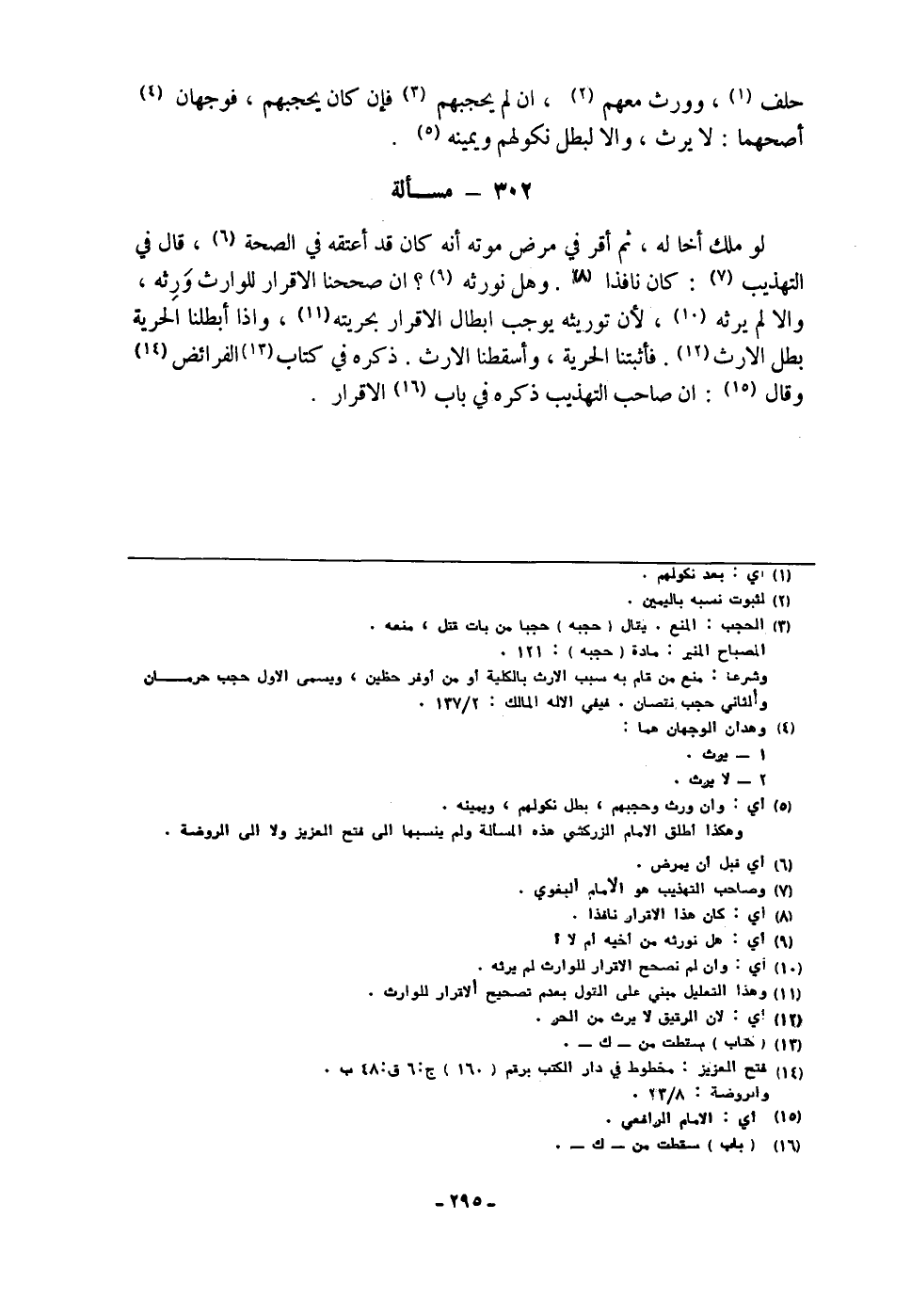- مَسْأَلَة لَو ملك أَخا لَهُ ثمَّ أقرّ فِي مرض مَوته أَنه كَانَ قد أعْتقهُ فِي الصِّحَّة قَالَ فِي التَّهْذِيب كَانَ نَافِذا وَهل نورثه إِن صححنا الْإِقْرَار للْوَارِث وَرثهُ وَإِلَّا لم يَرِثهُ لِأَن توريثه يُوجب إبِْطَال الْإِقْرَار بحريَّته وَإِذا أبطلنا الْحُرِّيَّة بَطل الْإِرْث فأثبتنا الْحُرِّيَّة وأسقطنا الْإِرْث ذكره فِي كتاب الْفَرَائِض وَقَالَ إِن صَاحب التَّهْذِيب ذكره فِي بَاب الْإِقْرَار