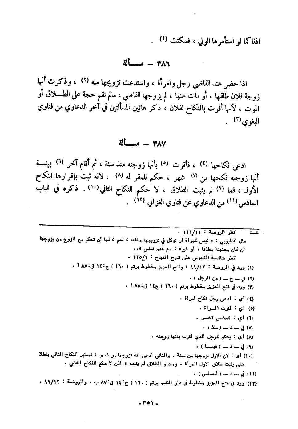 إِذا حضر عِنْد القَاضِي رجل وَامْرَأَة واستدعت تَزْوِيجهَا مِنْهُ وَذكرت أَنَّهَا زوجت فلَان طَلقهَا أَو مَاتَ عَنْهَا لم يُزَوّجهَا القَاضِي مَا لم تقم حجَّة على الطَّلَاق أَو الْمَوْت لِأَنَّهَا أقرَّت بِالنِّكَاحِ لفُلَان ذكر هَاتين الْمَسْأَلَتَيْنِ فِي آخر الدعاوي من فتاوي الْبَغَوِيّ