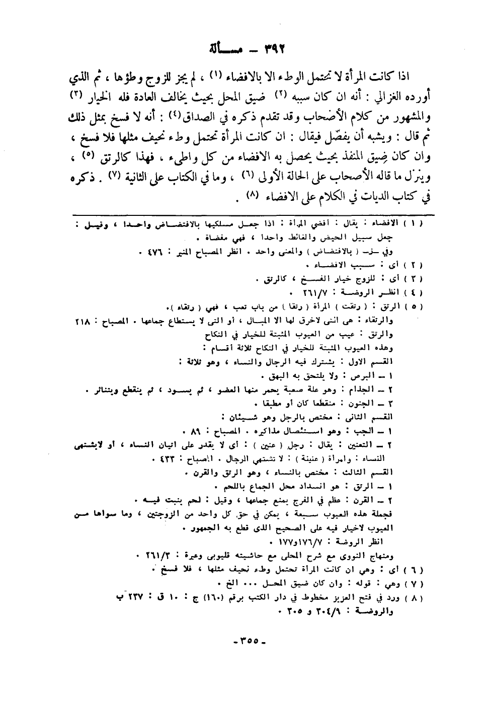 إِذا كَانَت الْمَرْأَة لَا تحْتَمل الْوَطْء إِلَّا بالإفضاء لم يجز للزَّوْج وَطْؤُهَا ثمَّ الَّذِي أوردهُ الْغَزالِيّ أَنه كَانَ سَببه ضيق الْمحل بِحَيْثُ يُخَالف الْعَادة فَلهُ الْخِيَار وَالْمَشْهُور من كَلَام الْأَصْحَاب وَقد تقدم ذكره فِي الصَدَاق أَنه لَا فسخ بِمثل ذَلِك ثمَّ قَالَ وَيُشبه أَن يفصل فَيُقَال إِن كَانَت الْمَرْأَة تحْتَمل وَطْء نحيف مثلهَا فَلَا فسخ وَإِن كَانَ ضيق المنفذ بِحَيْثُ يحصل بِهِ الْإِفْضَاء من كل واطىء فَهَذَا كالرتق وَينزل مَا قَالَه الْأَصْحَاب على الْحَالة الأولى وَمَا فِي الْكتاب على الثَّانِيَة ذكره فِي كتاب الدِّيات فِي الْكَلَام على الْإِفْضَاء