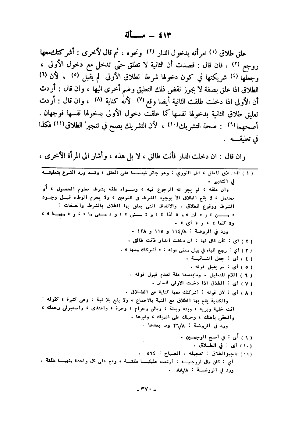 علق طَلَاق امْرَأَته بِدُخُول الدَّار وَنَحْوه ثمَّ قَالَ لأخرى أَشْرَكتك مَعهَا رُوجِعَ فَإِن قَالَ قصدت أَن الثَّانِيَة لَا تطلق حَتَّى تدخل مَعَ دُخُول الأولى وَجعلهَا شريكتها فِي كَون دُخُولهَا شرطا لطلاق الأولى لم يقبل لِأَن الطَّلَاق إِذا علق بِصفة لَا يجوز نقض ذَلِك التَّعْلِيق وَضم أُخْرَى إِلَيْهَا وَإِن قَالَ أردْت أَن الأولى إِذا دخلت طلقت الثَّانِيَة أَيْضا وَقع لِأَنَّهُ كِنَايَة وَإِن قَالَ أردْت تَعْلِيق طَلَاق الثَّانِيَة بِدُخُولِهَا نَفسهَا كَمَا علقت دُخُول الأولى بِدُخُولِهَا نَفسهَا فَوَجْهَانِ أصَحهمَا صِحَة التَّشْرِيك لِأَن التَّشْرِيك يَصح فِي تَنْجِيز الطَّلَاق فَكَذَا فِي تَعْلِيقه