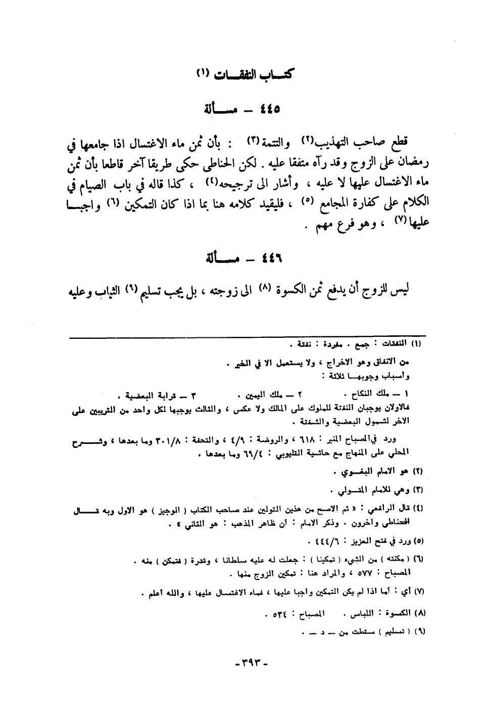 قطع صَاحب التَّهْذِيب والتتمة بِأَن ثمن مَاء الِاغْتِسَال إِذا جَامعهَا فِي رَمَضَان على الزَّوْج وَقد رَآهُ مُتَّفقا عَلَيْهِ لَكِن الحناطي حكى طَرِيقا آخر قَاطعا بِأَن ثمن مَاء الِاغْتِسَال عَلَيْهَا لَا عَلَيْهِ وَأَشَارَ إِلَى تَرْجِيحه كَذَا قَالَه فِي بَاب الصّيام فِي الْكَلَام على كَفَّارَة المجامع فليقيد كَلَامه هُنَا بِمَا إِذا كَانَ التَّمْكِين وَاجِبا عَلَيْهَا وَهُوَ فرع مِنْهُم