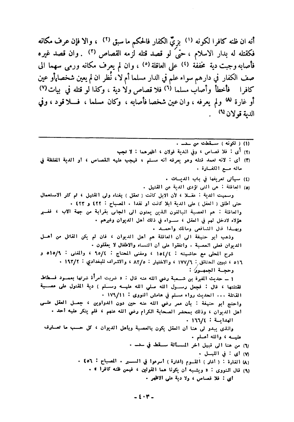 أَنه إِن ظَنّه كَافِرًا لكَونه بزِي الْكفَّار فَالْحكم مَا سبق وَإِلَّا فَإِن عرف مَكَانَهُ فكقتله لَهُ بدار الْإِسْلَام حَتَّى لَو قصد قَتله لزمَه الْقصاص وَإِن قصد غَيره فَأَصَابَهُ وَجَبت دِيَة مُخَفّفَة على الْعَاقِلَة وَإِن لم يعرف مَكَانَهُ وَرمى سَهْما إِلَى صف الْكفَّار فِي دَارهم سَوَاء علم فِي الدَّار مُسلما أم لَا نظر إِن لم يعين شخصا أَو عين كَافِرًا فَأَخْطَأَ وَأصَاب مُسلما فَلَا قصاص وَلَا دِيَة وَكَذَا لَو قَتله فِي بيات أَو غَارة وَلم يعرفهُ وَإِن عين شخصا فَأَصَابَهُ وَكَانَ مُسلما فَلَا قَود وَفِي الدِّيَة قَولَانِ