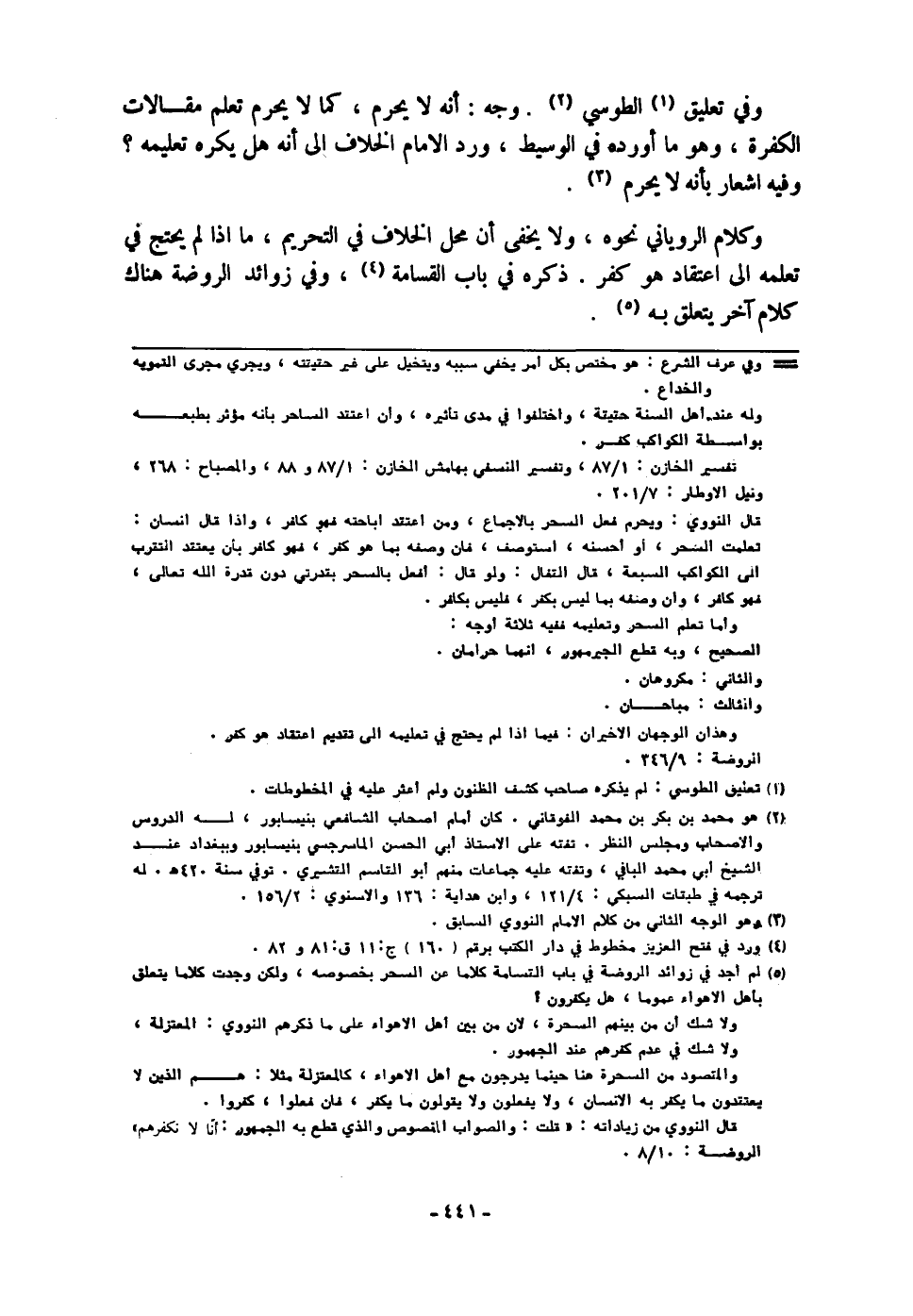 وَكَلَام الرَّوْيَانِيّ نَحوه وَلَا يخفى أَن مَحل الْخلاف فِي التَّحْرِيم مَا إِذا لم يحْتَج فِي تعلمه إِلَى اعْتِقَاد هُوَ كفر ذكره فِي بَاب الْقسَامَة وَفِي زَوَائِد الرَّوْضَة هُنَاكَ كَلَام آخر يتَعَلَّق بِهِ