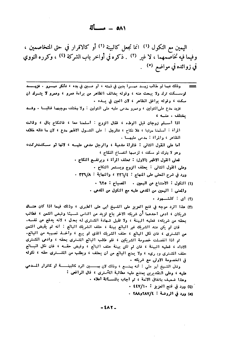 الْيَمين مَعَ النّكُول إِنَّمَا تجْعَل كالبينة أَو كالاقرار فِي حق المتخاصمين وَفِيمَا فِيهِ تخاصمهما لَا غير ذكره فِي أَوَاخِر بَاب الشّركَة وكرره النَّوَوِيّ فِي زوائده فِي مَوَاضِع