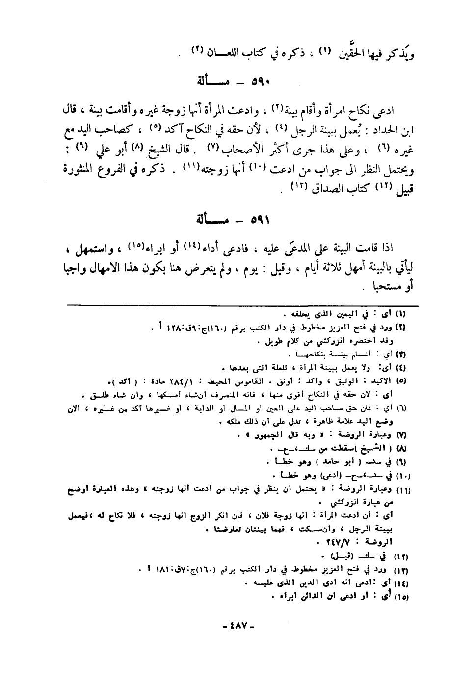 ادّعى نِكَاح امْرَأَة وَأقَام بَيِّنَة وَادعت الْمَرْأَة أَنَّهَا زَوْجَة غَيره وأقامت بَيِّنَة قَالَ ابْن الْحداد يعْمل بِبَيِّنَة الرجل لِأَن حَقه فِي النِّكَاح آكِد كصاحب الْيَد مَعَ غَيره وعَلى هَذَا جرى أَكثر الْأَصْحَاب قَالَ الشَّيْخ أَبُو عَليّ وَيحْتَمل النّظر إِلَى جَوَاب من ادَّعَت أَنَّهَا زَوجته ذكره فِي الْفُرُوع المنثورة قبيل كتاب الصَدَاق