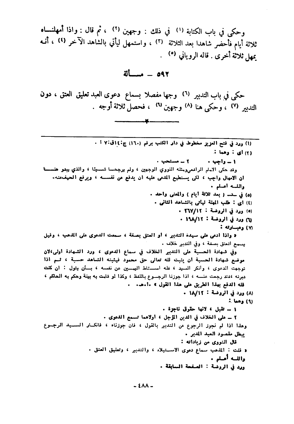 وَحكى فِي بَاب الْكِتَابَة فِي ذَلِك وَجْهَيْن ثمَّ قَالَ وَإِذا أمهلناه ثَلَاثَة أَيَّام فأحضر شَاهدا بعد الثَّلَاثَة واستمهل ليَأْتِي بِالشَّاهِدِ الآخر أَنه يُمْهل ثَلَاثَة أُخْرَى قَالَه الرَّوْيَانِيّ