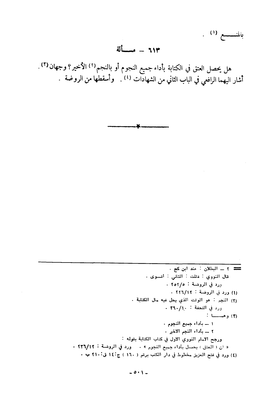هَل يحصل الْعتْق فِي الْكِتَابَة بأَدَاء جَمِيع النُّجُوم أَو بِالنَّجْمِ الْأَخير وَجْهَان أَشَارَ إِلَيْهِمَا الرَّافِعِيّ فِي الْبَاب الثَّانِي من الشَّهَادَات وأسقطها من الرَّوْضَة