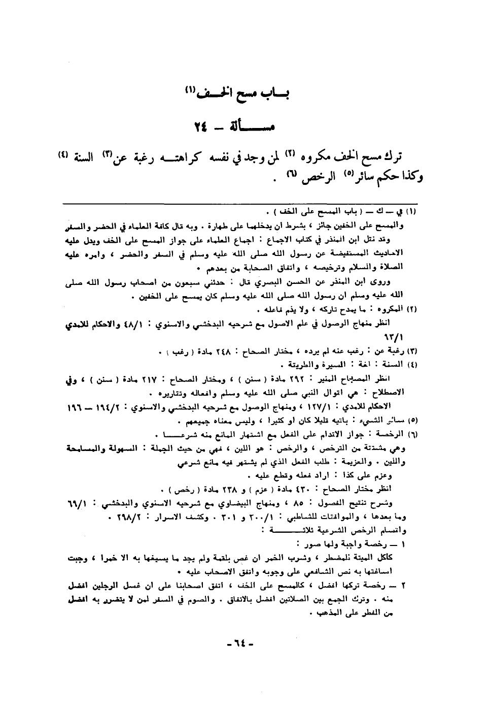 ترك مسح الْخُف مَكْرُوه لمن وجد فِي نَفسه كَرَاهَته رَغْبَة عَن السّنة وَكَذَا حكم سَائِر الرُّخص