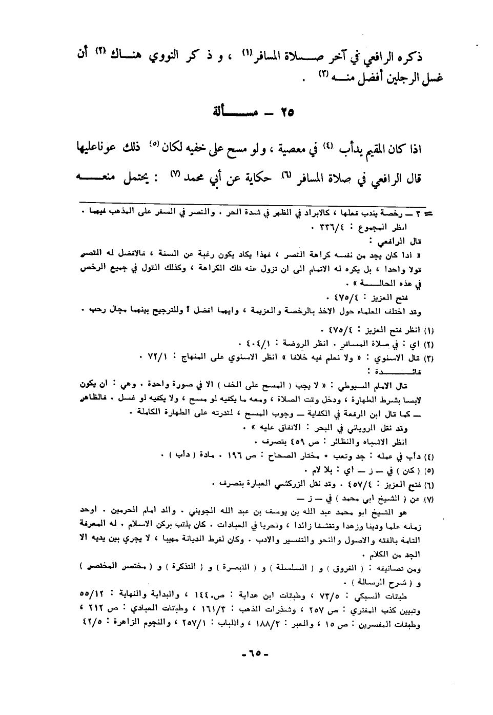 ذكره الرَّافِعِيّ فِي آخر صَلَاة الْمُسَافِر وَذكر النَّوَوِيّ هُنَاكَ أَن غسل الرجلَيْن أفضل مِنْهُ