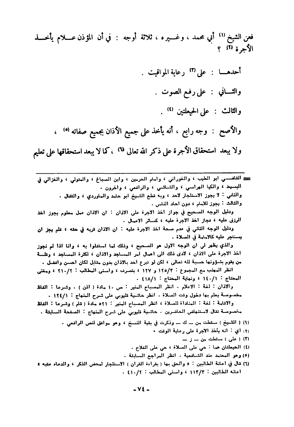 فَعَن الشَّيْخ أبي مُحَمَّد وَغَيره ثَلَاثَة أوجه فِي أَن الْمُؤَذّن علام يَأْخُذ الْأُجْرَة