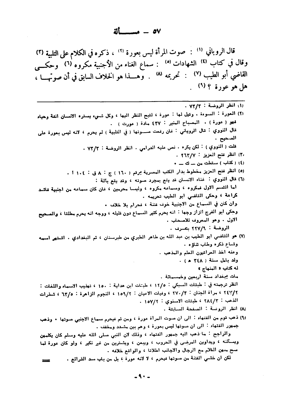 قَالَ الروباني صَوت الْمَرْأَة لَيْسَ بِعَوْرَة ذكره فِي الْكَلَام عَن التَّلْبِيَة وَقَالَ فِي كتاب الشَّهَادَات سَماع الْغناء من الْأَجْنَبِيَّة مَكْرُوه وَحكى القَاضِي أَبُو الطّيب تَحْرِيمه وَهَذَا هُوَ الْخلاف السَّابِق أَن صَوتهَا هَل هُوَ عَورَة