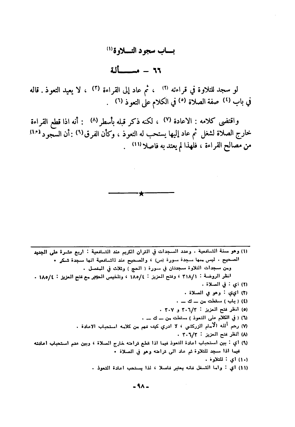 وَاقْتضى كَلَامه الإعاده لِأَنَّهُ ذكر قبله بأسطر أَنه إِذا قطع الْقِرَاءَة خَارج الصَّلَاة لشغل ثمَّ عَاد إِلَيْهَا يسْتَحبّ لَهُ التَّعَوُّذ وَكَأن الْفرق أَن السُّجُود من مصَالح الْقِرَاءَة فَلهَذَا لم يعْتد بِهِ فاصلا