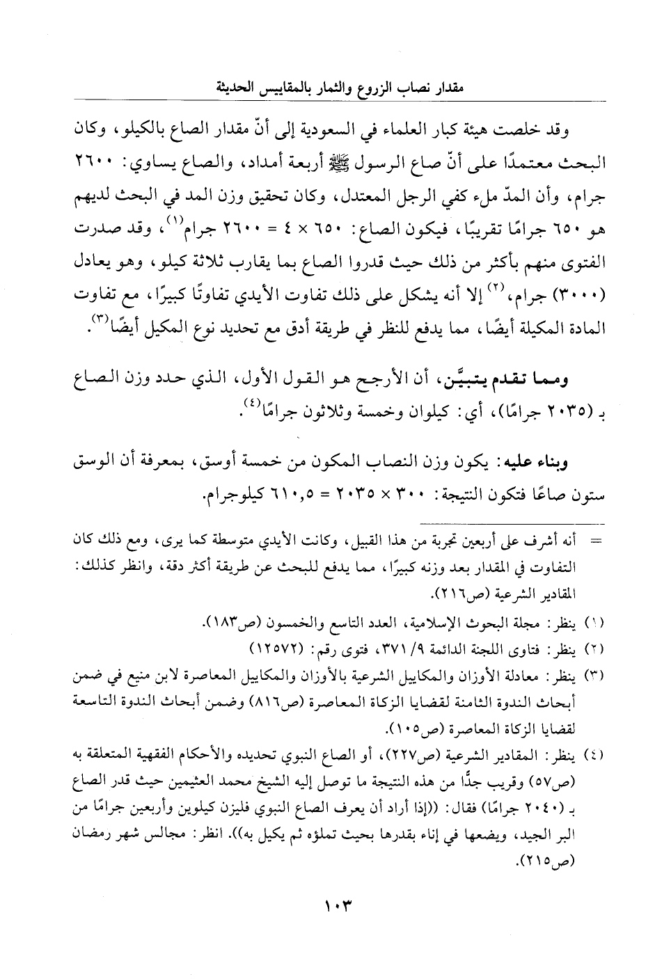 (¬4) ينظر: المقادير الشرعية (ص 227)، أو الصاع النبوي تحديده والأحكام الفقهية المتعلقة به (ص 57) وقريب جدًّا من هذه النتيجة ما توصل إليه الشيخ محمد العثيمين حيث قدر الصاع بـ (2040 جرامًا) فقال: "إذا أراد أن يعرف الصاع النبوي فليزن كيلوين وأربعين جرامًا من البر الجيد، ويضعها في إناء بقدرها بحيث تملؤه ثم يكيل به". انظر: مجالس شهر رمضان (215).